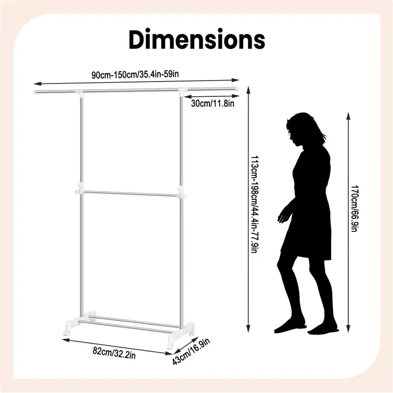 Het BukkitBow Uitschuifbaar Kledingrek op Wielen biedt veelzijdige opbergmogelijkheden voor uw kleding, of u nu extra hangruimte nodig heeft in uw garderobe of een handige oplossing zoekt voor de wasruimte. Gemaakt van roestvrij staal met plastic onderdelen, is dit kledingrek duurzaam en stabiel, met een maximale belastbaarheid van 30 kg. Het is uitbreidbaar in zowel breedte (90-150 cm) als hoogte (113-198 cm), waardoor het aan verschillende opslagbehoeften kan voldoen en een gezellige ruimte kan creëren.