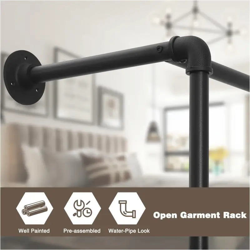 Het kledingrek is gebouwd om lang mee te gaan, met matzwarte gelakte stalen buizen en krasbestendige MDF-planken die samen een solide en duurzaam geheel vormen. Met bijgeleverde pluggen en 8 ringen (φ: 9 cm) kan het stevig en stabiel aan de muur worden bevestigd, zonder wiebelen. Door zijn wandgemonteerde ontwerp bespaart dit kledingrek kostbare vloerruimte en biedt het tegelijkertijd voldoende opbergruimte met een kledingrail en een plank.