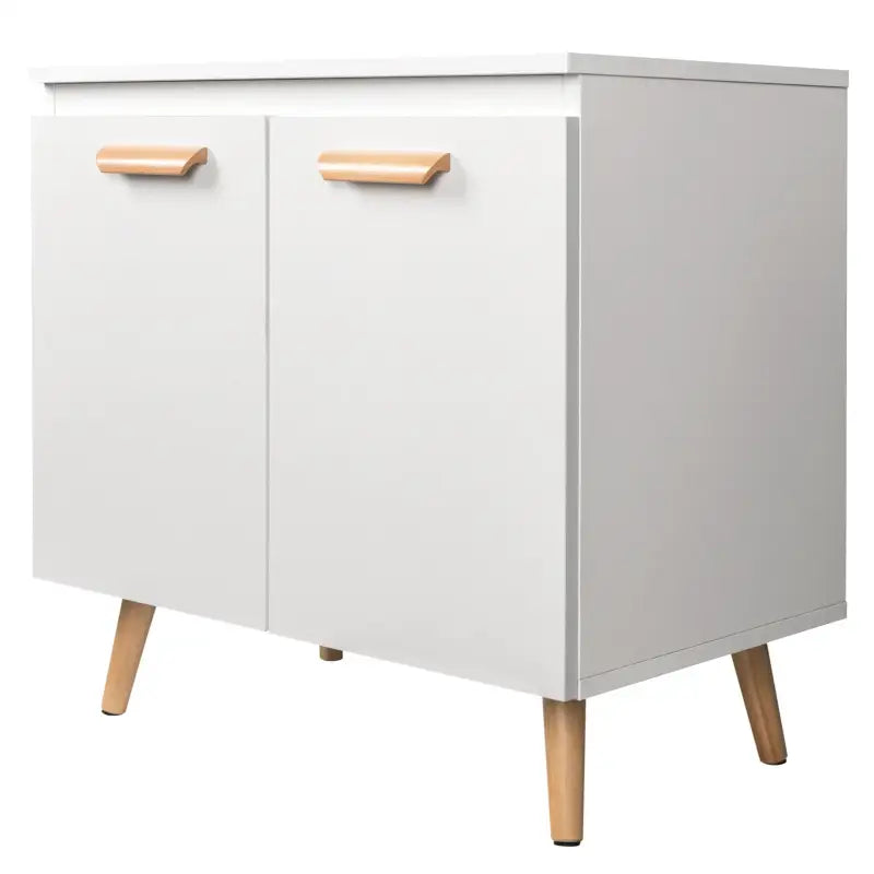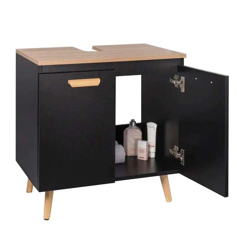 Dankzij de ruime opbergruimte biedt deze kast voldoende plaats voor het opbergen van al uw badkamerbenodigdheden, zoals shampoo, douchegel, cosmetica en toiletartikelen. Met zijn elegante stijl en twee deuren past deze kast perfect in elke kamer en kan hij niet alleen als badkamerkast worden gebruikt, maar ook in gangen, balkons en andere ruimtes. De solide houten poten zorgen voor stabiliteit en duurzaamheid, waardoor de kast lang meegaat.