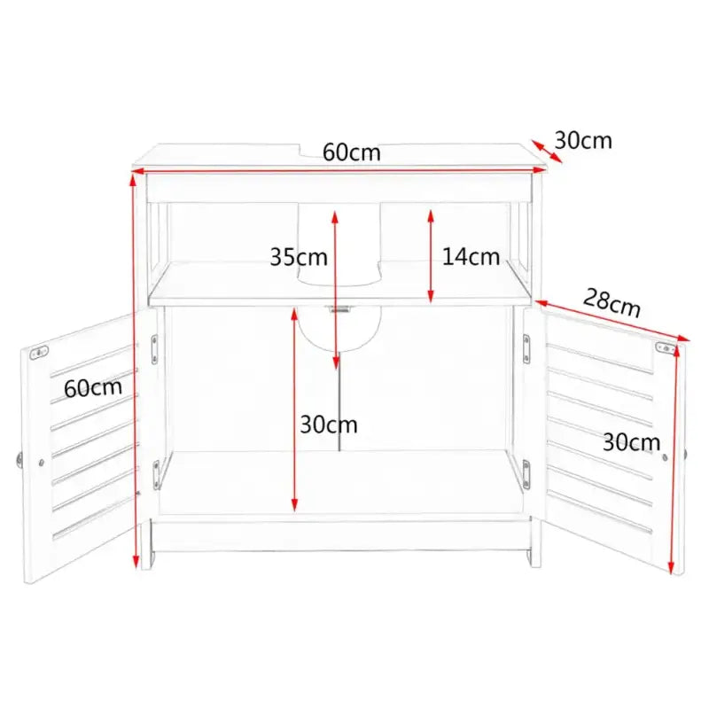 Deze wastafelkast is eenvoudig te monteren dankzij de meegeleverde montagebouten en duidelijke instructies. Het wordt geleverd in een gedemonteerde verpakking voor eenvoudige montage. Bovendien is de kast gemakkelijk te onderhouden met een vochtige doek, waardoor hij er altijd schoon en fris uitziet. Let op: droog de witte kast goed af om verkleuring te voorkomen. Met afmetingen van ongeveer 60 x 30 x 60 cm (LxBxH) en een uitsparing van 20 x 13 cm voor de wastafelpoot, past deze kast perfect in uw badkamer.