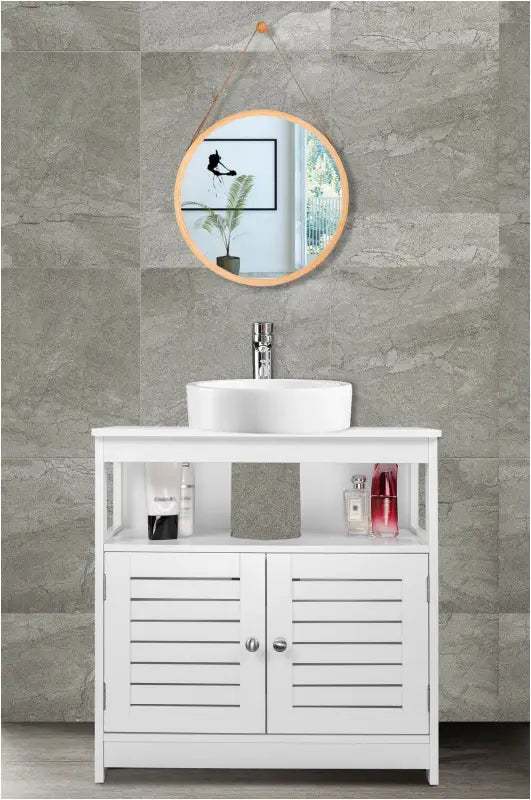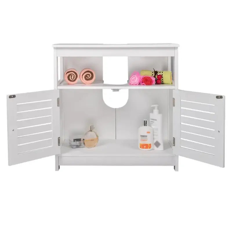Deze wastafelkast is ontworpen met verstelbare planken, waardoor u uw badkamerspullen naar wens kunt organiseren. Met een compact ontwerp biedt de kast voldoende ruimte om al uw badkameraccessoires netjes op te bergen. De bovenste plank heeft een hoogte van ongeveer 14 cm, terwijl de onderste plank een hoogte heeft van ongeveer 30 cm, waardoor u genoeg ruimte heeft voor verschillende voorwerpen.