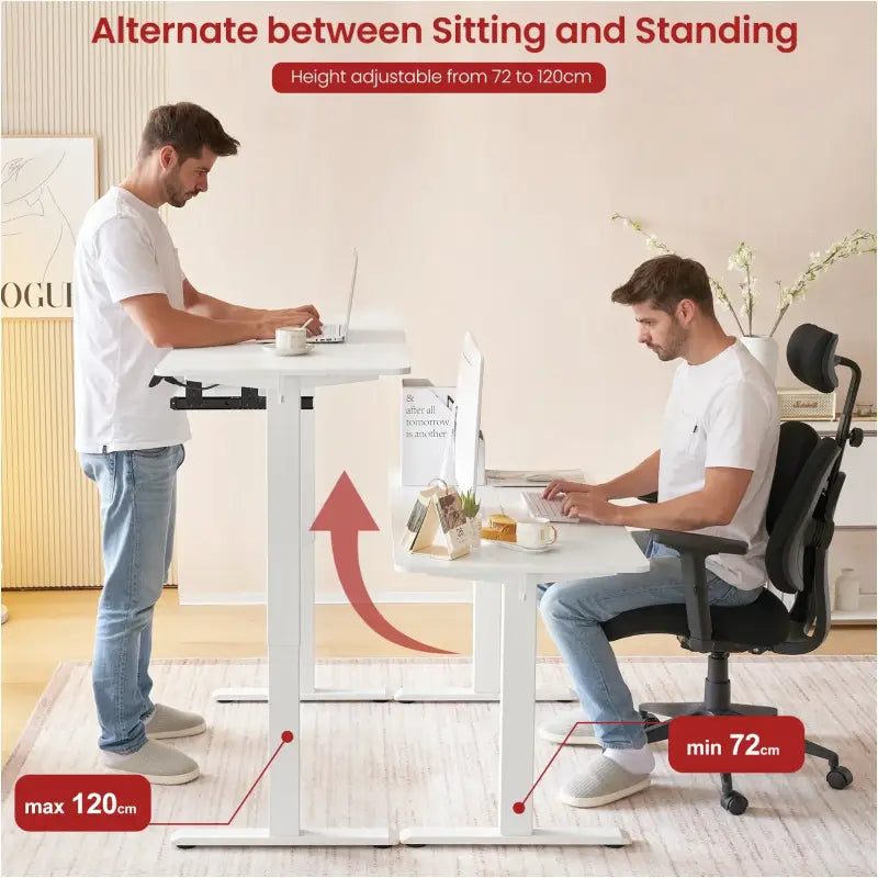 Het BukkitBow zit-sta bureau biedt een perfecte balans tussen zitten en staan, waardoor u de hoogte gemakkelijk kunt aanpassen aan uw behoeften. Met een verstelbare hoogte van 72 tot 120 cm kunt u genieten van optimaal comfort, wat niet alleen uw gezondheid en welzijn verbetert, maar ook uw productiviteit verhoogt. De hoogte is eenvoudig aan te passen met behulp van de elektrische bediening, waardoor u moeiteloos kunt wisselen tussen zitten en staan gedurende de dag.