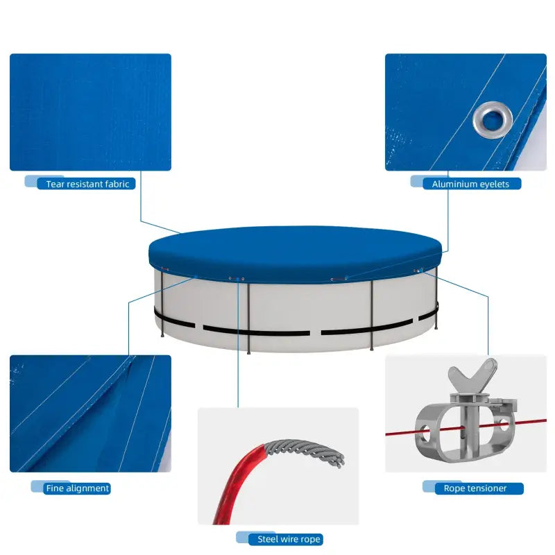 Dit zwembadzeil wordt geleverd met verbeterde accessoires voor extra gemak en een langere levensduur. De sterke en duurzame aluminium zeilogen en versterkingen zorgen ervoor dat uw zwembad langdurig beschermd blijft. Het afdekzeil kan eenvoudig worden gemonteerd door de staalkabel door de ogen aan de zoom van het waterdichte zeil te rijgen en vervolgens stevig op het zwembad te bevestigen met behulp van de aluminium accessoires.