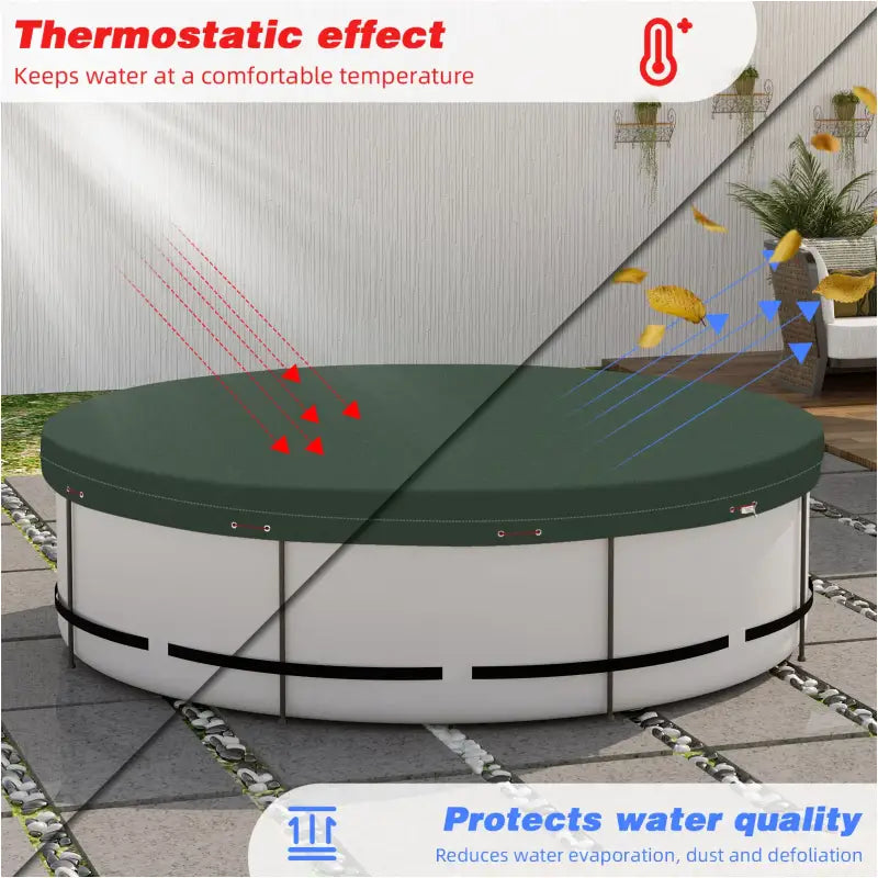 Het BukkitBow Zwembadzeil biedt uitstekende bescherming voor uw zwembad gedurende alle seizoenen. Gemaakt van nieuw PE-materiaal met een gewicht van 200 g/m², is dit afdekzeil sterk, scheurbestendig, waterdicht en UV-bestendig. Het zorgt ervoor dat uw zwembad schoon blijft door stof en bladeren buiten te houden, terwijl de speciale coating de groei van algen voorkomt. Dit afdekzeil vermindert ook warmteverlies tijdens de wintermaanden, waardoor het zwembadwater langer warm blijft en vorstvorming wordt voorkomen.