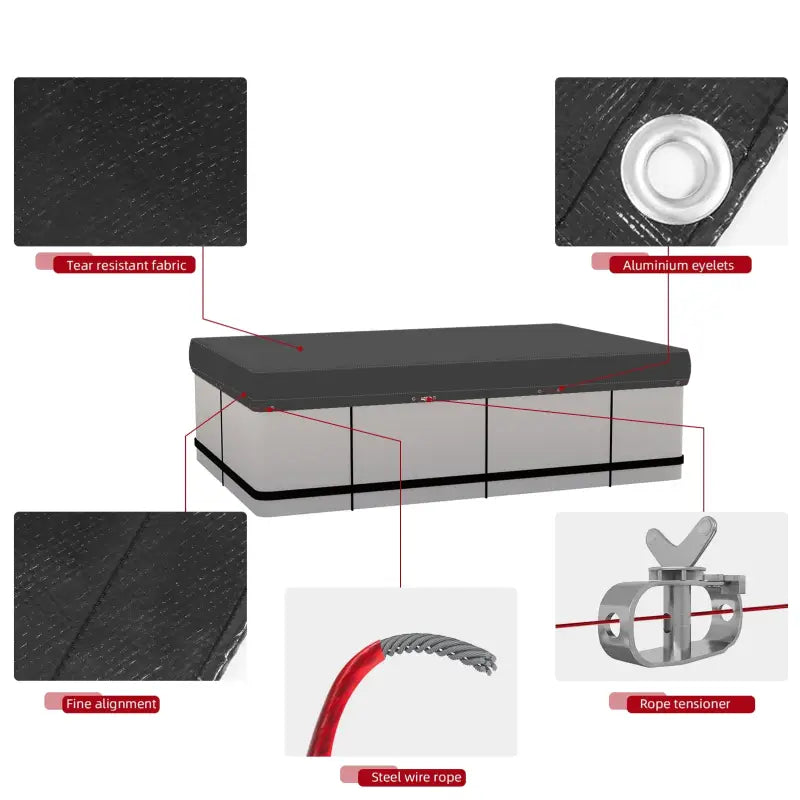 Dankzij de aluminium ogen en meegeleverde staalkabel is de installatie van dit zwembadzeil een fluitje van een cent. Met een omranding voorzien van zoom en aluminium ogen op 50 cm afstand, kun je de kabel eenvoudig doorvoeren en het zeil stevig vastmaken. Het zeil beschermt jouw zwembad niet alleen tegen stof, bladeren en vuil, maar maakt ook het schoonmaken gemakkelijker, waardoor je meer tijd hebt om van jouw zwembad te genieten.