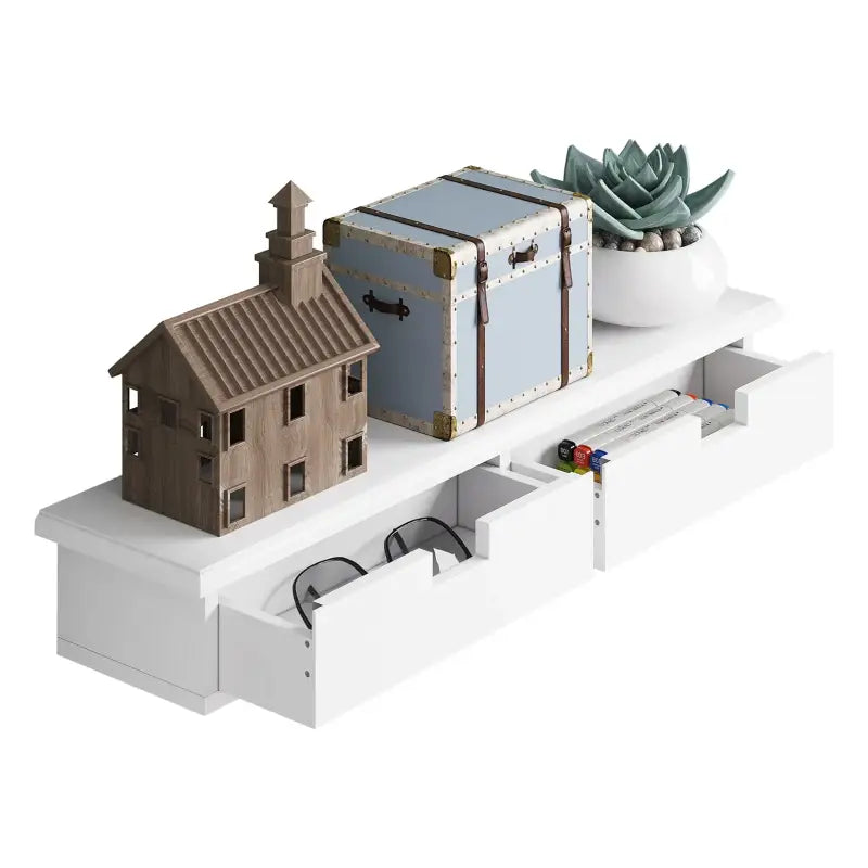 Elke lade van deze wandplank is voorzien van een verzonken handgreep voor gemakkelijk openen en sluiten, en valbeveiligingen zorgen ervoor dat de laden stevig op hun plaats blijven zitten. Gemaakt van hoogwaardig MDF, kan deze plank tot 10 kg aan gewicht dragen, terwijl de witte laklaag niet alleen een moderne uitstraling biedt, maar ook waterbestendigheid en eenvoudig onderhoud garandeert.