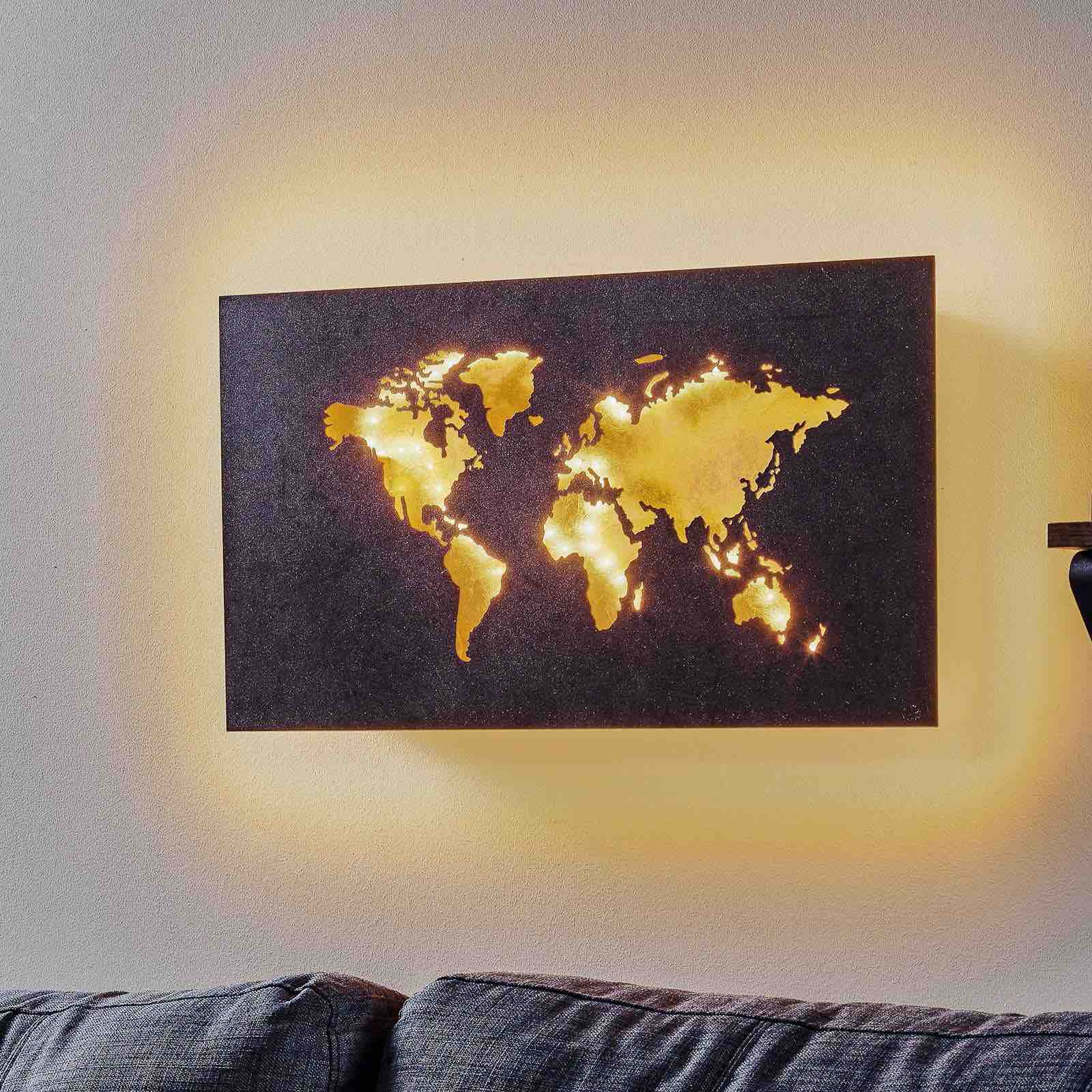 De wereldkaart biedt een warm en sfeervol licht dat perfect is voor het creëren van een gezellige ambiance. De geïntegreerde LED-technologie zorgt voor een energiezuinige en duurzame verlichting met een lange levensduur. Geniet van het warme licht dat de wandlamp goud verspreidt en breng een aangename sfeer in je interieur.
