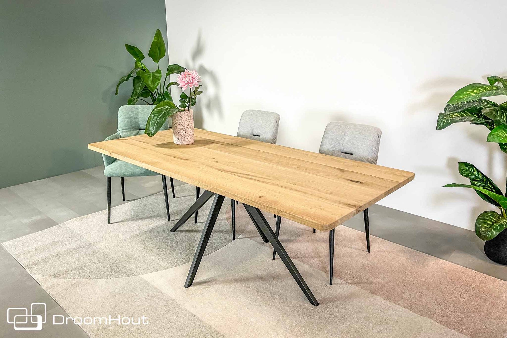 De tafel Raffinato is voorzien van een matrix kruispoot. Deze is gemaakt van industrieel staal met een stoere zwarte poedercoat. De poot is mooi slank waardoor het goed tot zijn recht komt onder het 3 cm dik eiken blad. De Raffinato heeft een hele goede afwerking, waardoor je heerlijk kunt leven aan de tafel. Er zit een 2 componenten lak op het tafelblad, dit houdt in dat het optimaal beschermd is. Hou je van de natuurlijke uitstraling van eiken, dan kies je voor een blank eiken blad. Wil je warmer eiken, dan behandelen wij het blad voor met een naturel olie. Houd je van een frisse look, dan is de wit eiken variant wat voor jou.