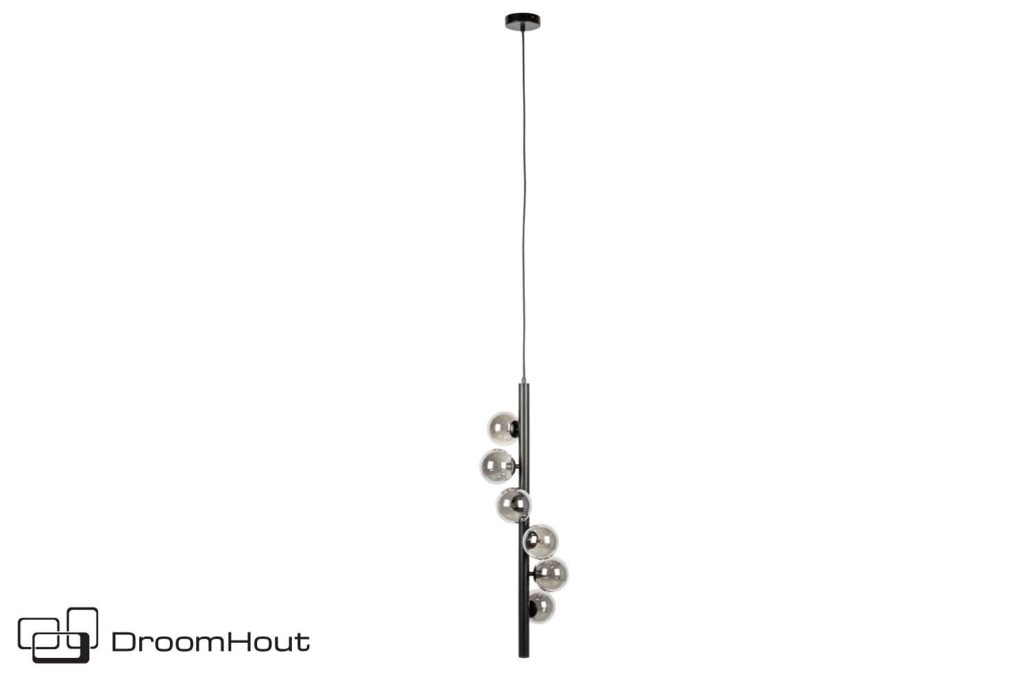 Het frame van hanglamp Monica is recht en strak zwart gelakt. Aan dit frame zijn maar liefst 6 glazen bollen bevestigd. Je hebt de keuze uit smoke glas of opaal glazen bollen. Het geheel hangt aan een 150 cm lange zwarte katoenen kabel. Deze kabel is natuurlijk in te korten. De totale afmeting is ø 28 x 150 cm.