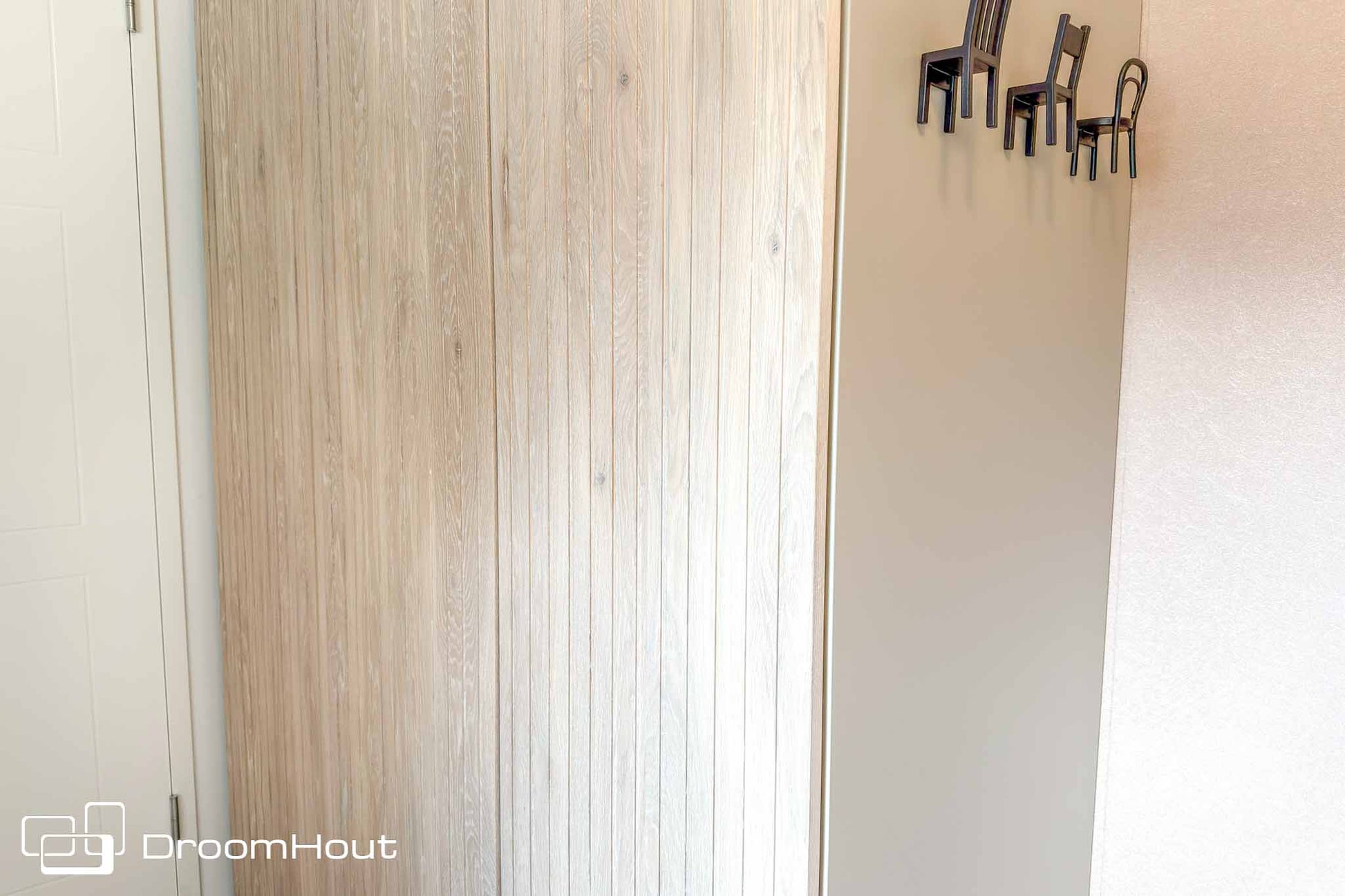 We hebben onze DroomHout-kleuren alvast voor je uitgezocht. Of je nu gaat voor een neutrale, blank eiken afwerking of een warme notenhouten uitstraling, wij zijn ervan overtuigd dat we de kastdeuren perfect kunnen laten aansluiten op jouw interieur. Wil je nog meer keuze? Dan kun je kiezen voor een lattenstructuur. Helemaal on-trend! Dit geeft niet alleen een luxe uitstraling, maar de verticale lattenstructuur zorgt er ook voor dat jouw kamer optisch hoger en ruimer lijkt. Win-win, als je het ons vraagt! Psst deze tip kun je ook toepassen op je houten badkamermeubels.
