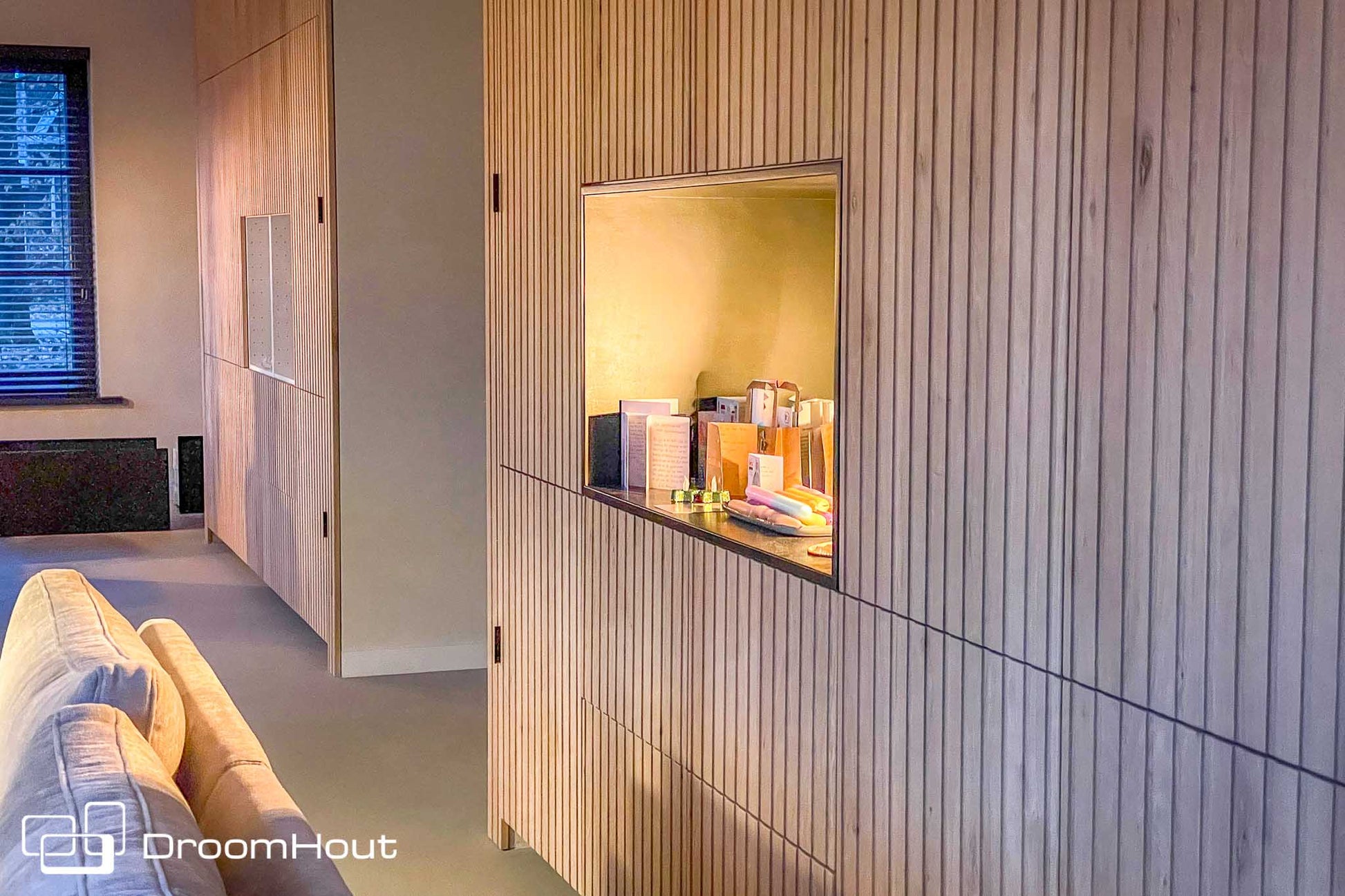 Dit houten keukenfront met latstructuur is ook echt een topper. Vrij nieuw in de collectie maar nu al een hit. Deze houten latjes zie je op dit moment overal. Vooral de wandpanelen met houten latten kom je veel tegen. Maar nu kan je dus ook je houten keuken met houten latten uitvoeren. De standaard lattenstructuur zelf is 4cm breed met een voeg van 1 cm. Hiermee breekt het lekker in je keuken en geeft een mooie high end design uitstraling. Dit houten keukenfront met latstructuur werken we af met een matte blanke lak. Deze kleur blank eiken lijkt misschien wel het meest op onbehandeld hout en heeft dus een zeer natuurlijke uitstraling. Tevens beschermt de matte blanke laklaag je keukenfronten heel goed. Vlekken zijn dus verleden tijd.