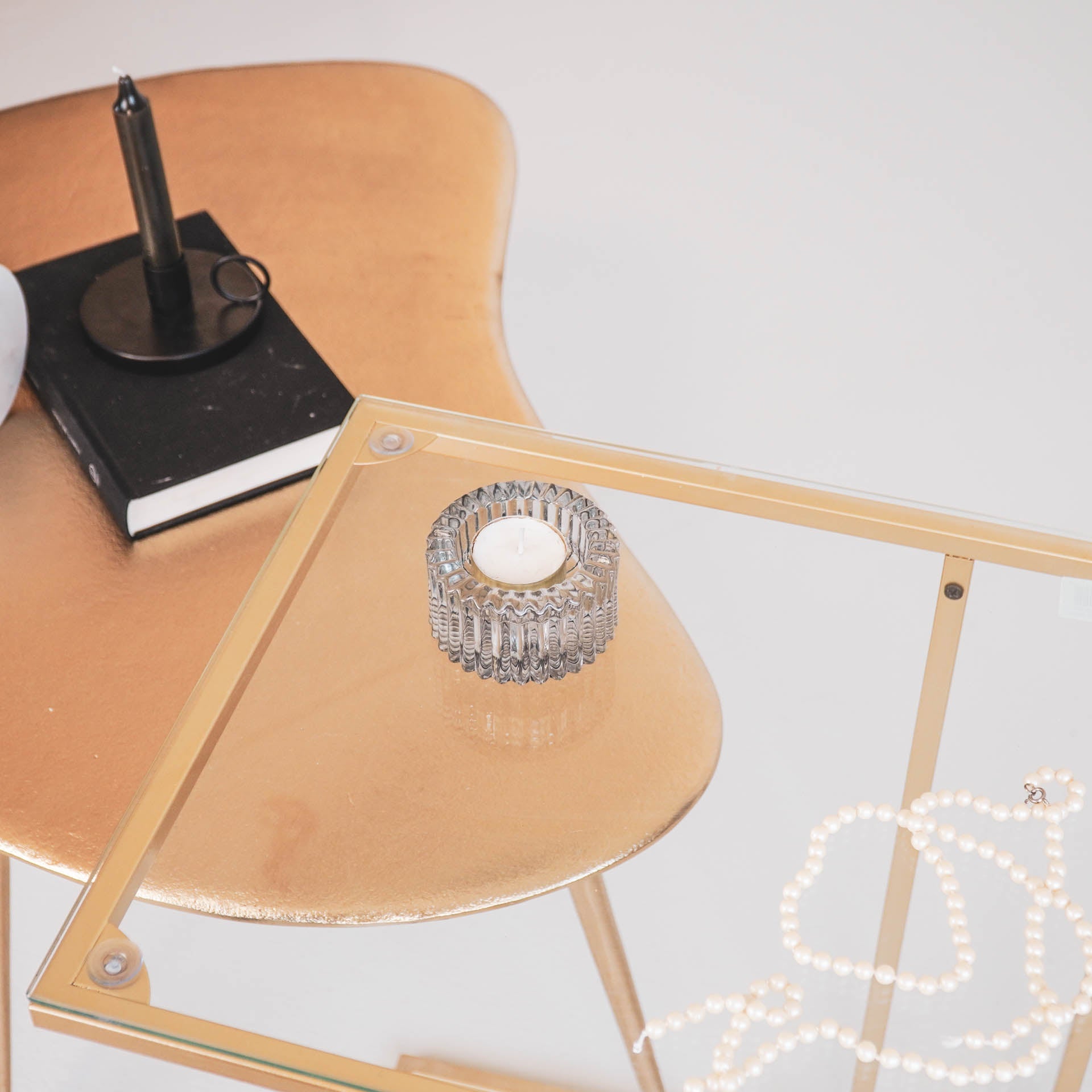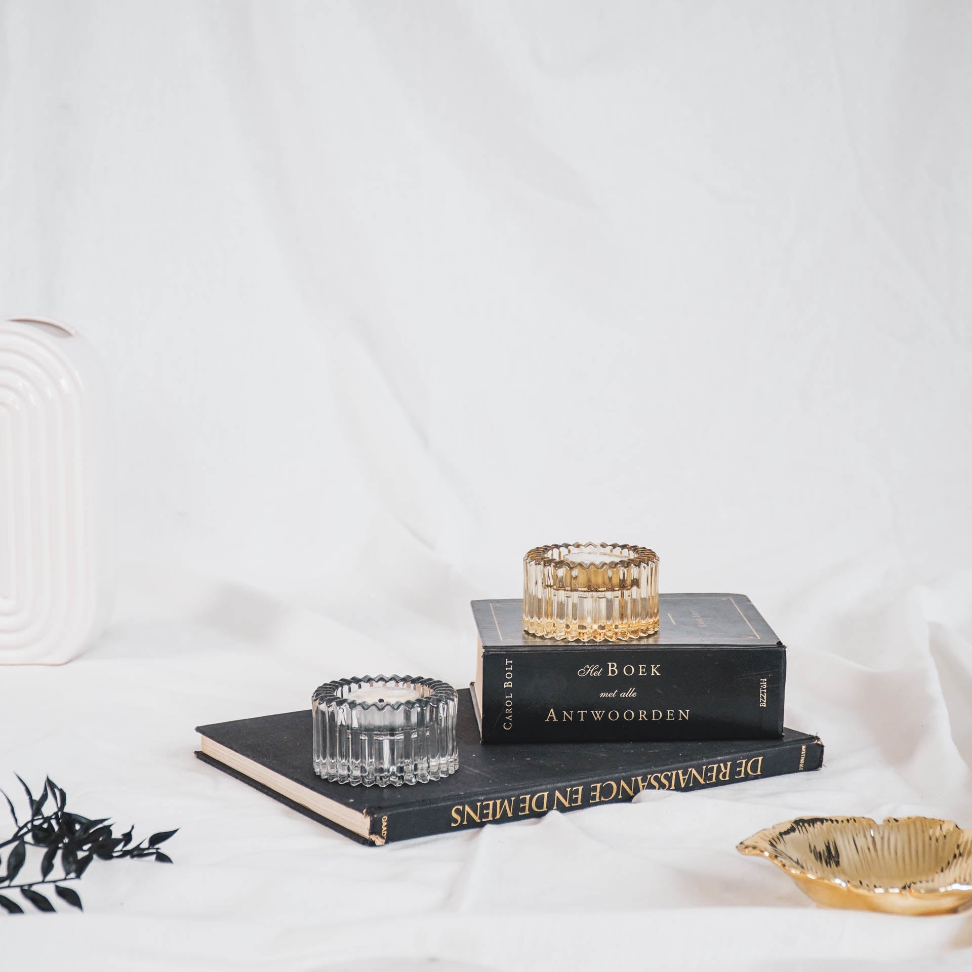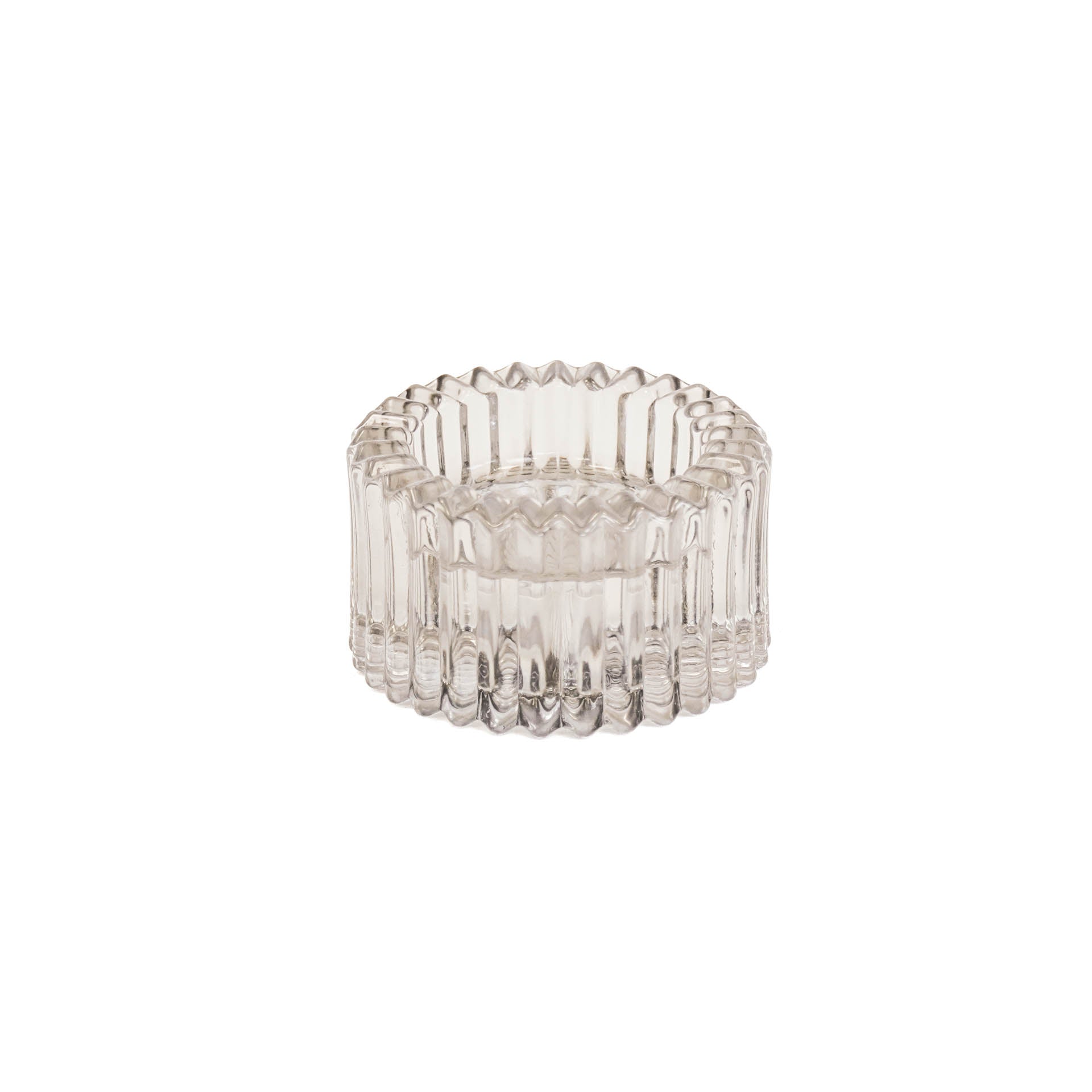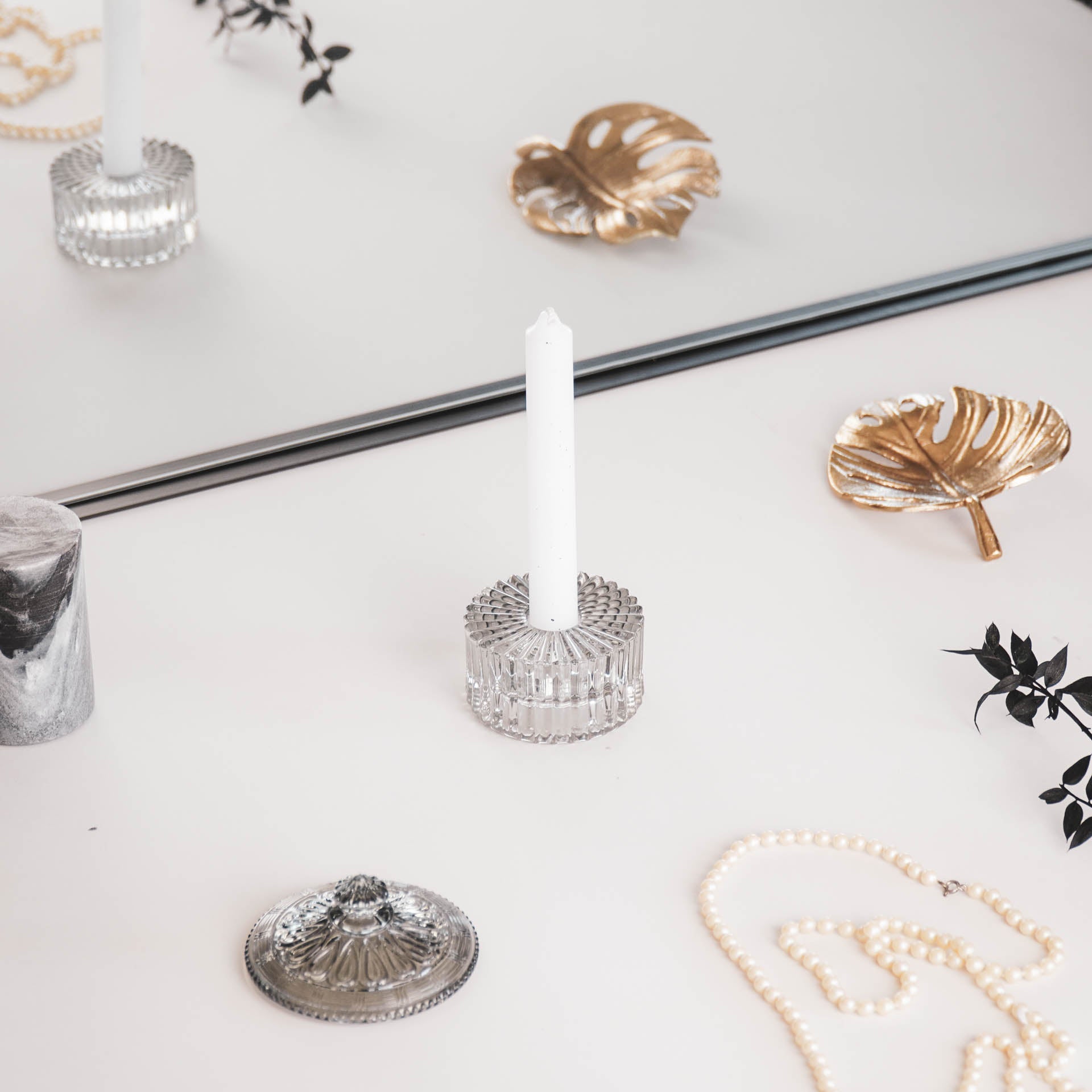 LIGHT IT UP- Ben je op zoek naar een stijlvolle toevoeging aan je interieur? Deze prachtige kaarshouder-kandelaar van Housevitamin is precies wat je nodig hebt! Gemaakt van glas met een mooi reliëf, deze glazen kaarshouder is de perfecte combinatie van elegantie en modern design. Aan de ene kant kan er een dinerkaars in en als je hem omdraait past er een theelichtje in. Net waar je zin in hebt!