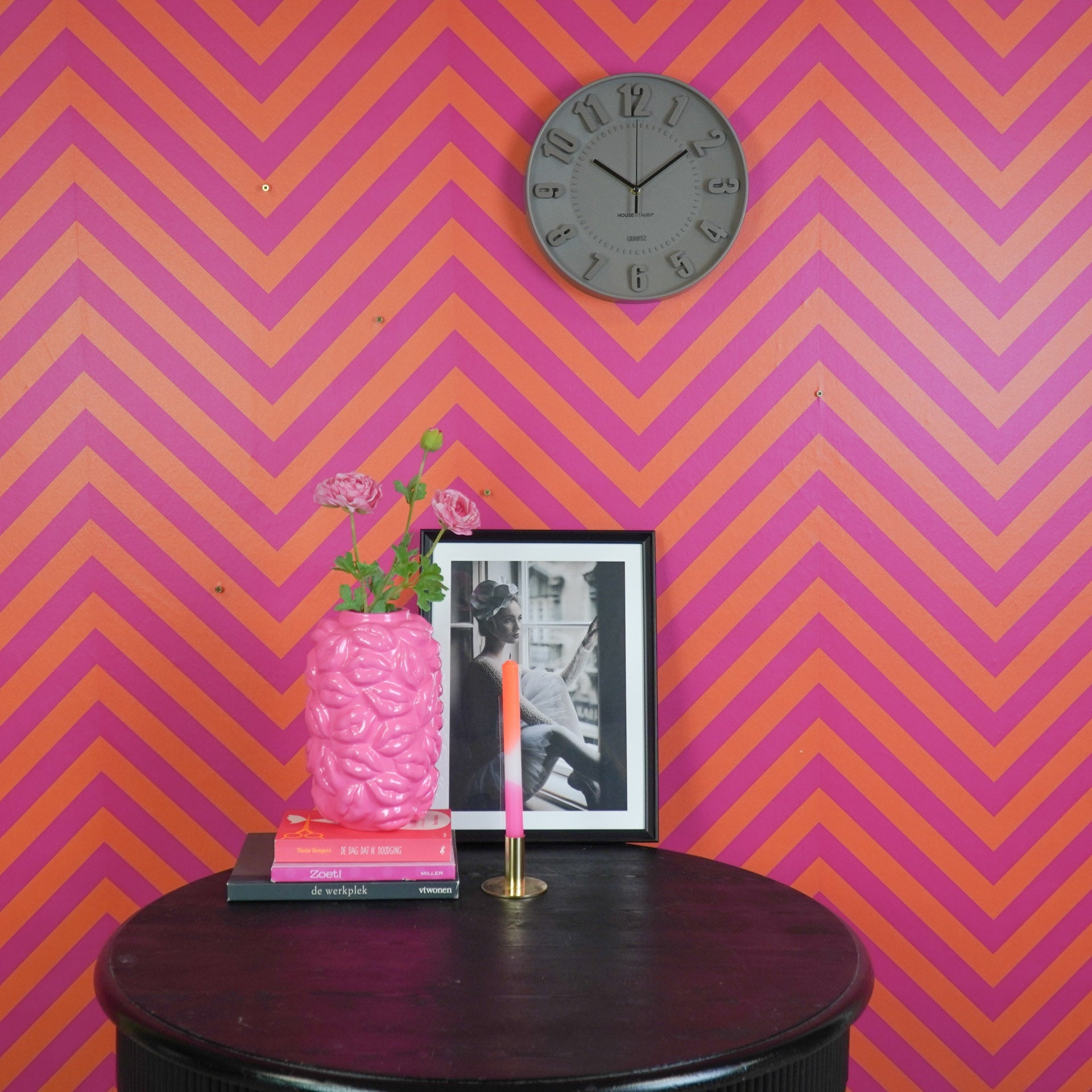 Styling tip: Hang de gekleurde wand klok in zijn eentje aan de muur of combineer hem juist met andere ronde vormen.