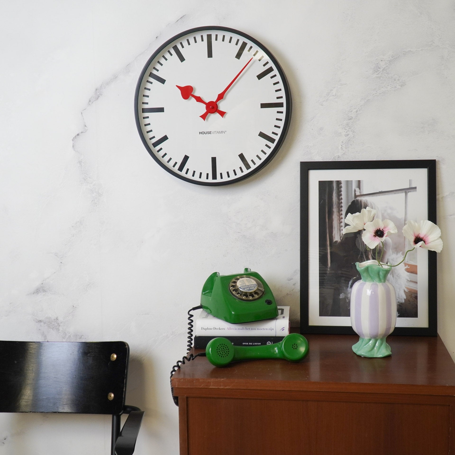 BLIJF JE WEL BIJ DE TIJD? De tijd staat aan onze kant en we moeten hem wel laten shinen! Wij hebben de leukste en hipste klokken gemaakt, zodat zij jouw interieur kunnen rocken (en jou op tijd laten zijn). Maak kennis met onze strakke basic wandklok, geïnspireerd op het iconische stationsklokdesign dat synoniem staat voor helderheid en functionaliteit. Deze klok combineert het vertrouwde, tijdloze uiterlijk van de klassieke stationsklok met een moderne, minimalistische uitstraling, perfect voor een eigentijds interieur.