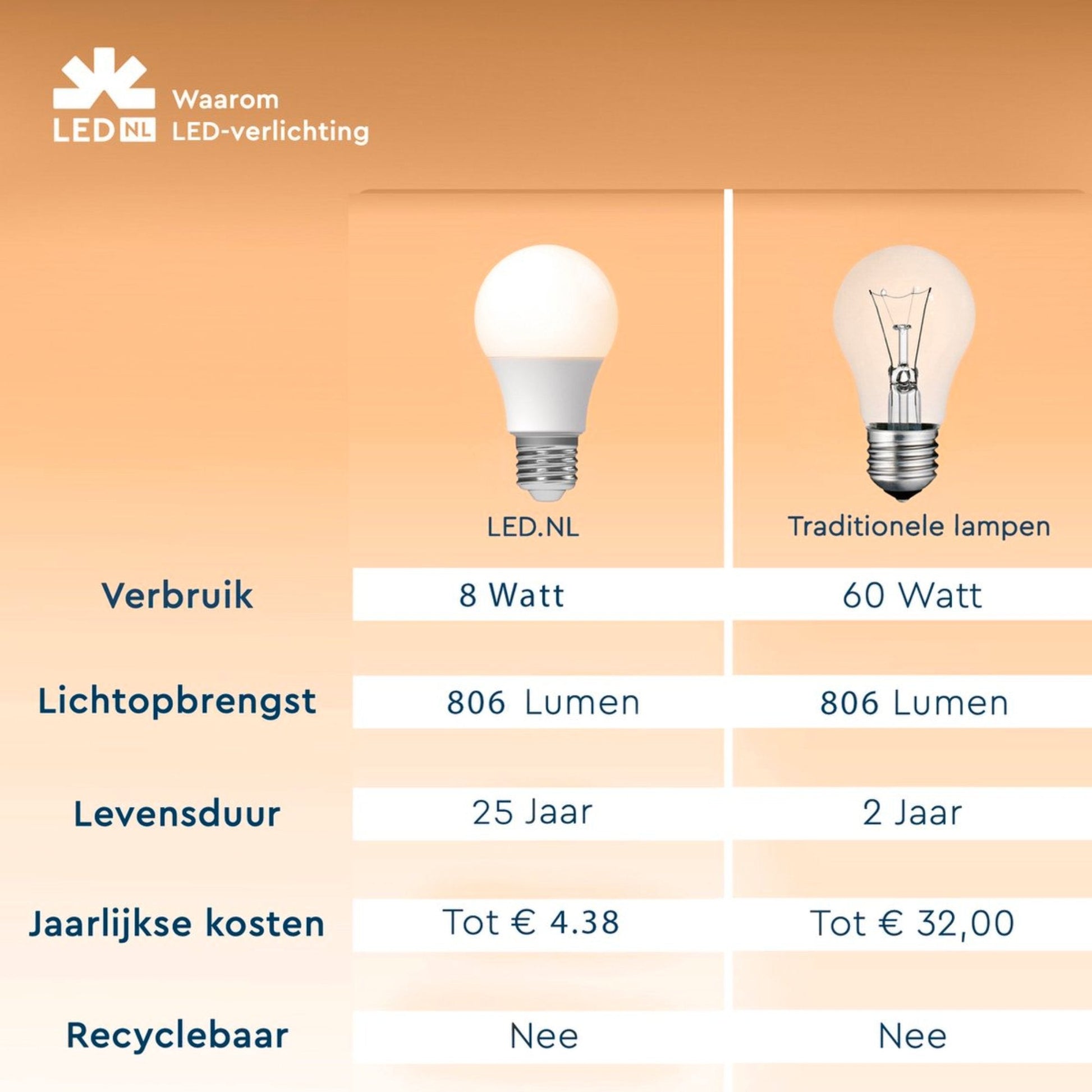 Traditionele lampen met een gelijkwaardige lichtopbrengst verbruiken maar liefst 60 watt. Met deze zuinige led-lampen bespaar je tot 80%, deze verbruiken namelijk slechts 8 watt. Daarbij profiteer je ook van een extreem lange levensduur.