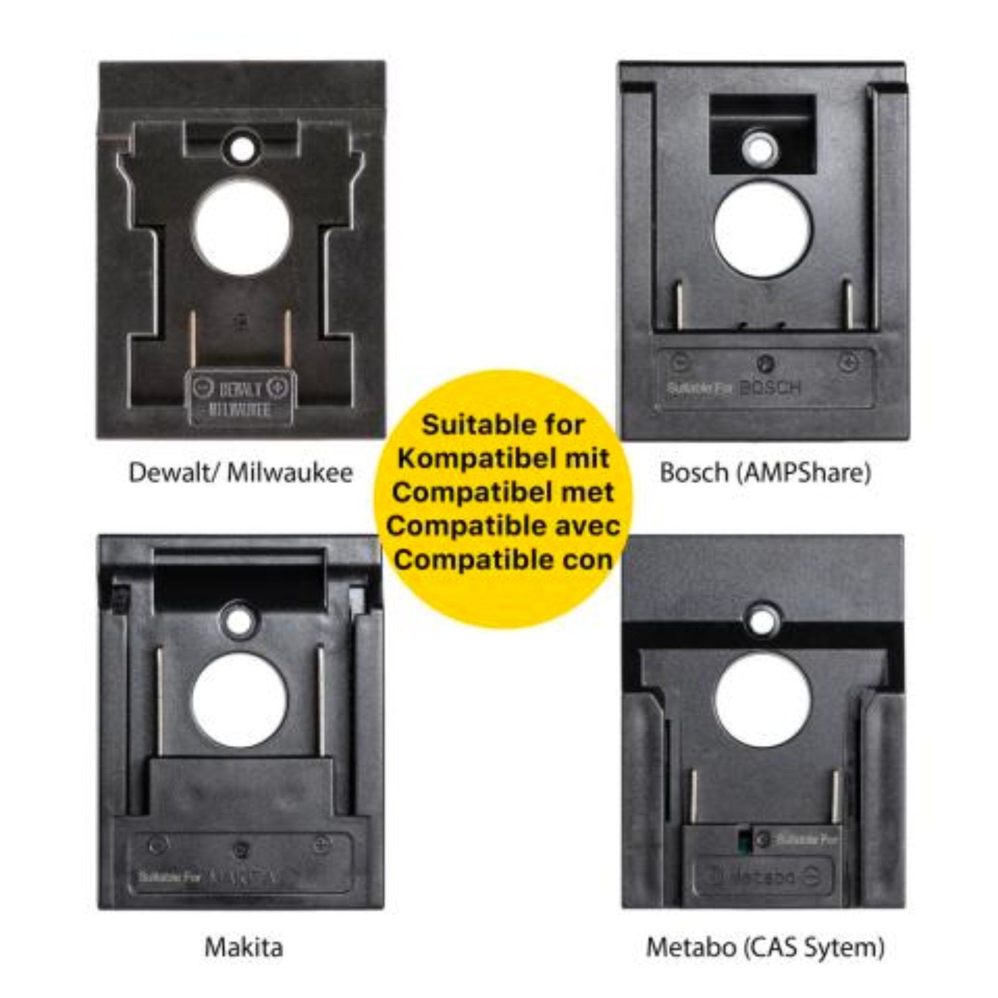 Geen zorgen meer over het vinden van een stroombron. Deze LED bouwlamp is universeel oplaadbaar met elke standaard 18V accu, waardoor je de vrijheid hebt om overal te werken. De bouwlamp wordt geleverd met 4 accuhouders die geschikt zijn voor de meeste gangbare merken powertools op de markt, zoals DeWalt, Milwaukee, Makita, Bosch, Metabo (CAS systeem) en Bosch (Ampshare).