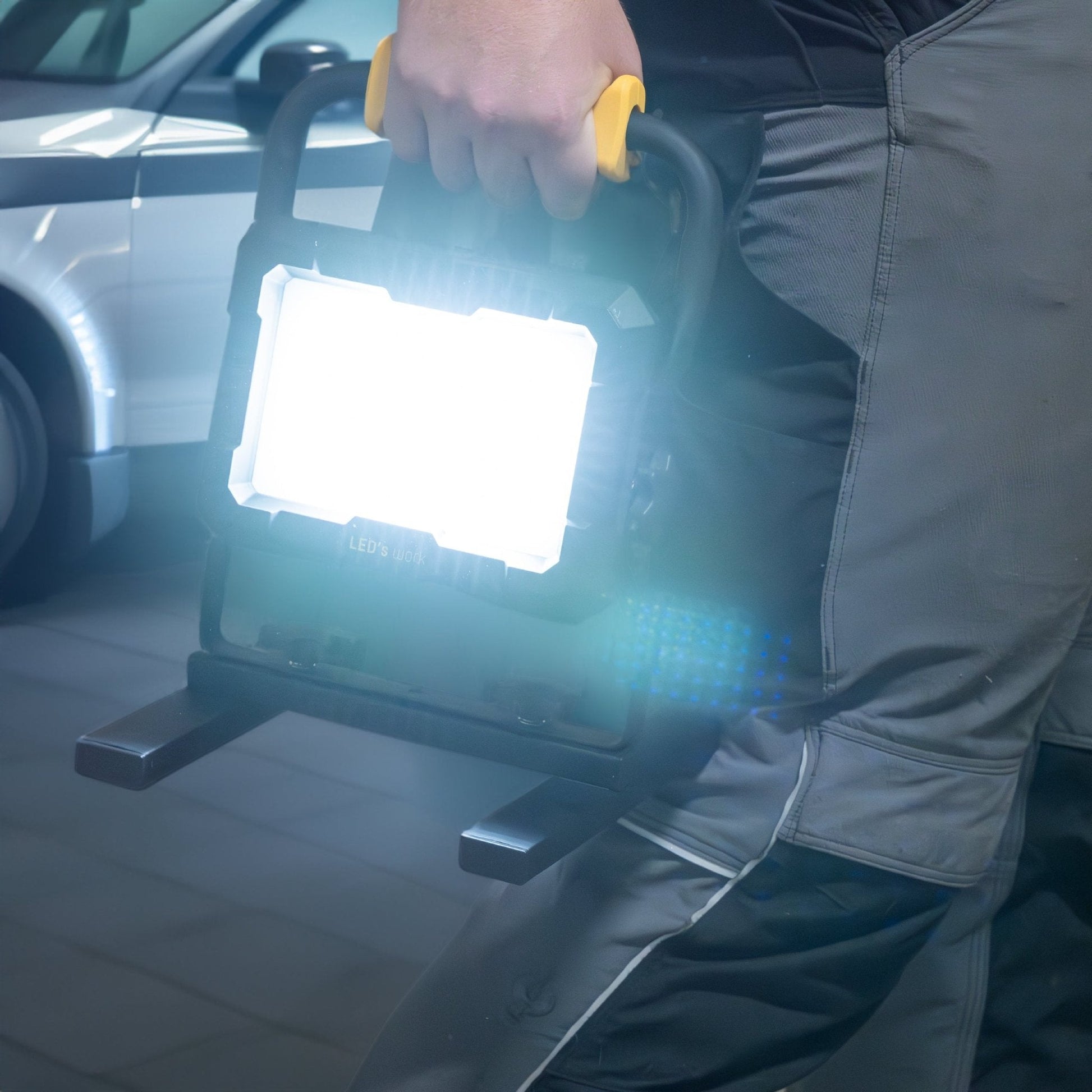 Dankzij de draaibare kop schijn je het licht altijd precies daar waar jij het hebben wil. Klaar met klussen? Dan neem je de lichtgewicht bouwlamp weer gemakkelijk mee. Hij heeft een compact formaat en je kunt hem eenvoudig inklappen om vervolgens mee te nemen of op te bergen.