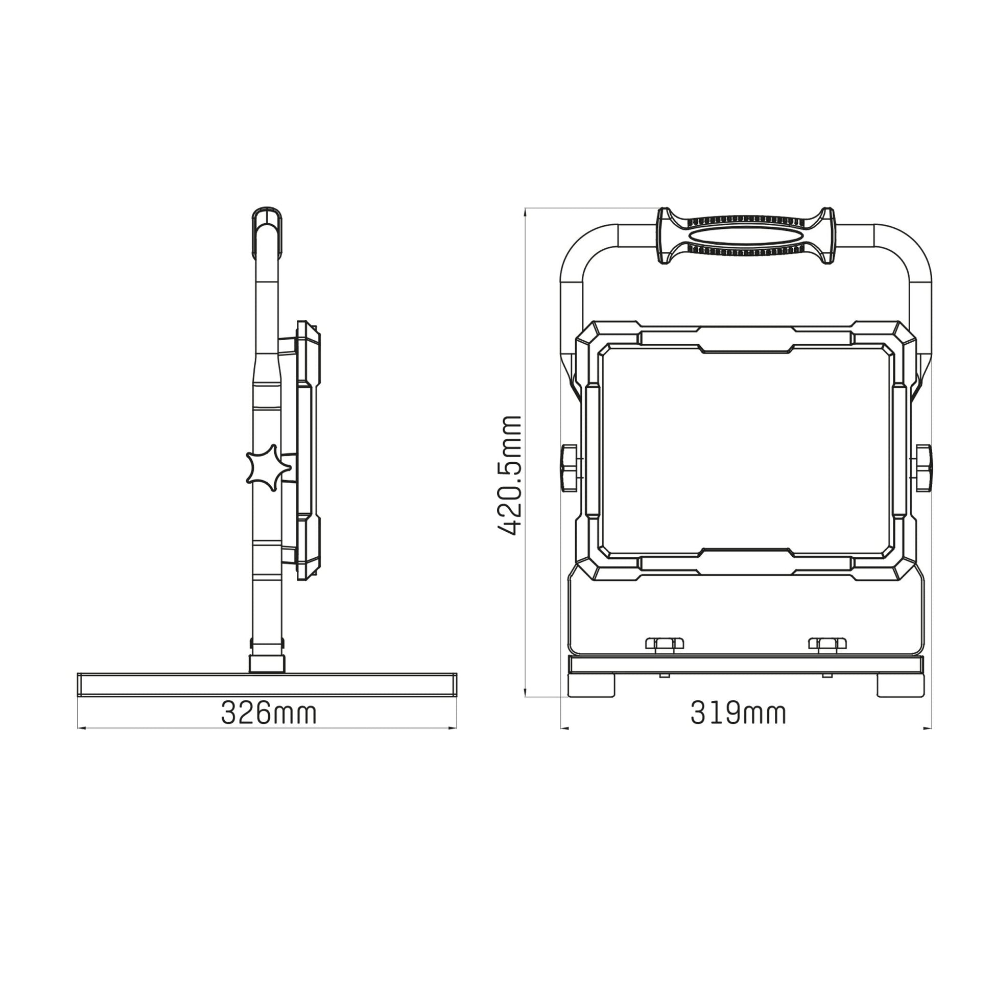 De afmetingen van deze bouwlamp zijn 319 x 326 x 421 mm. Dankzij het geringe gewicht en de ergonomische handgreep neem je hem gemakkelijk overal mee naartoe. De extra sterke kabel (H07RN-F 2X1.0 mm²) heeft een lengte van 5 meter, waardoor je van veel bewegingsvrijheid geniet.