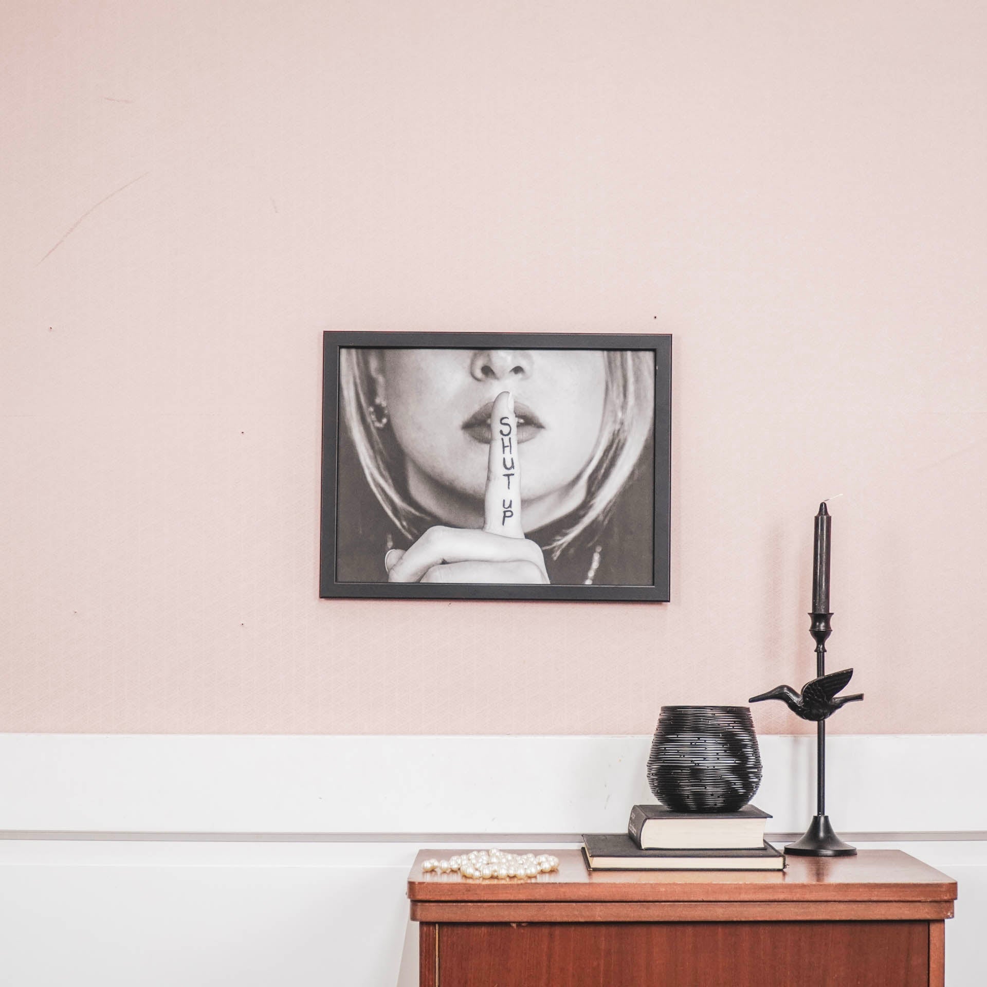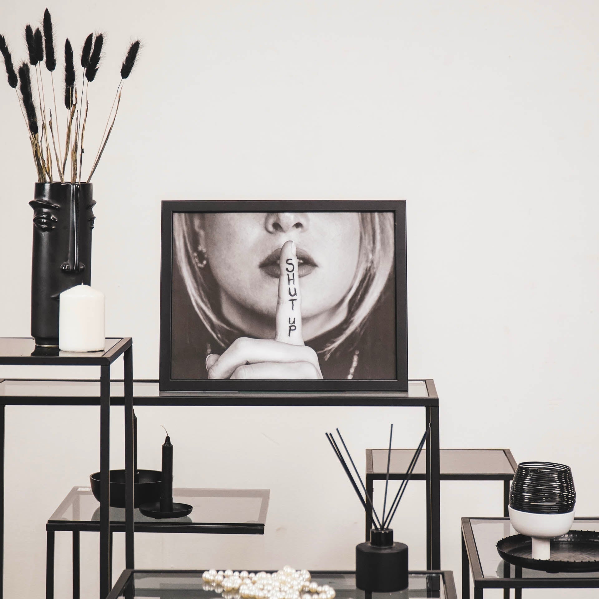 WALL ART - Met grote trots presenteren wij onze kunst posters. Zwart wit posters met kunst foto's en quotes. Op deze zwart wit poster wordt 'Shut up' op een stijlvolle manier geuit. Waar zou jij deze modieuze poster met quote ophangen?