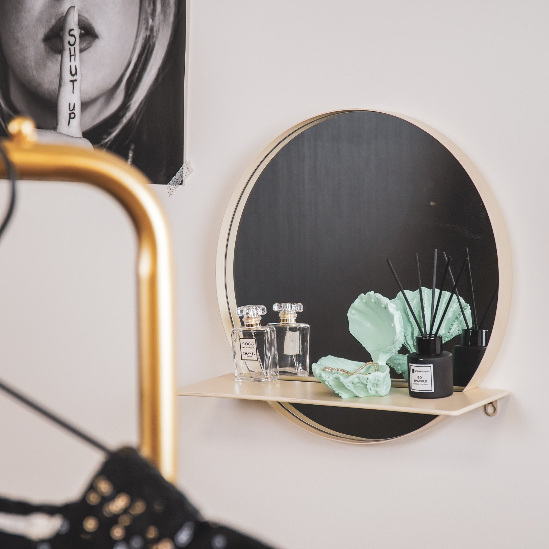 MIRROR MIRROR - Ronde vormen zijn mega populair! Met deze ronde metalen spiegel breng je niet alleen ronde vormen in jouw interieur, dankzij de spiegel crreëer je een gevoel van ruimte. Het metalen plankje is ideaal voor bijvoorbeeld jouw lippenstift en zorgt ervoor dat je hem ook nog eens fantastisch kunt af stylen!