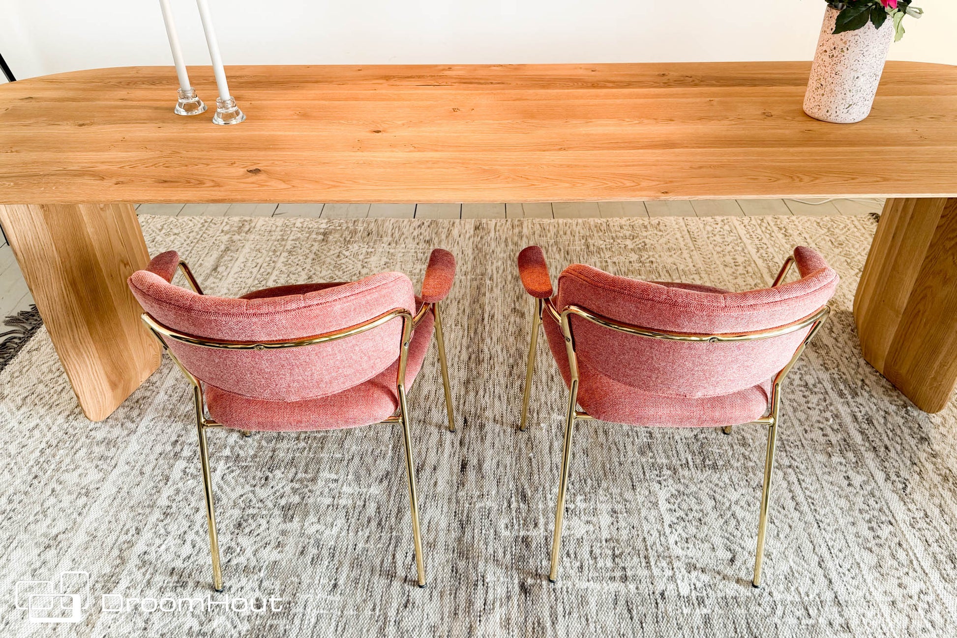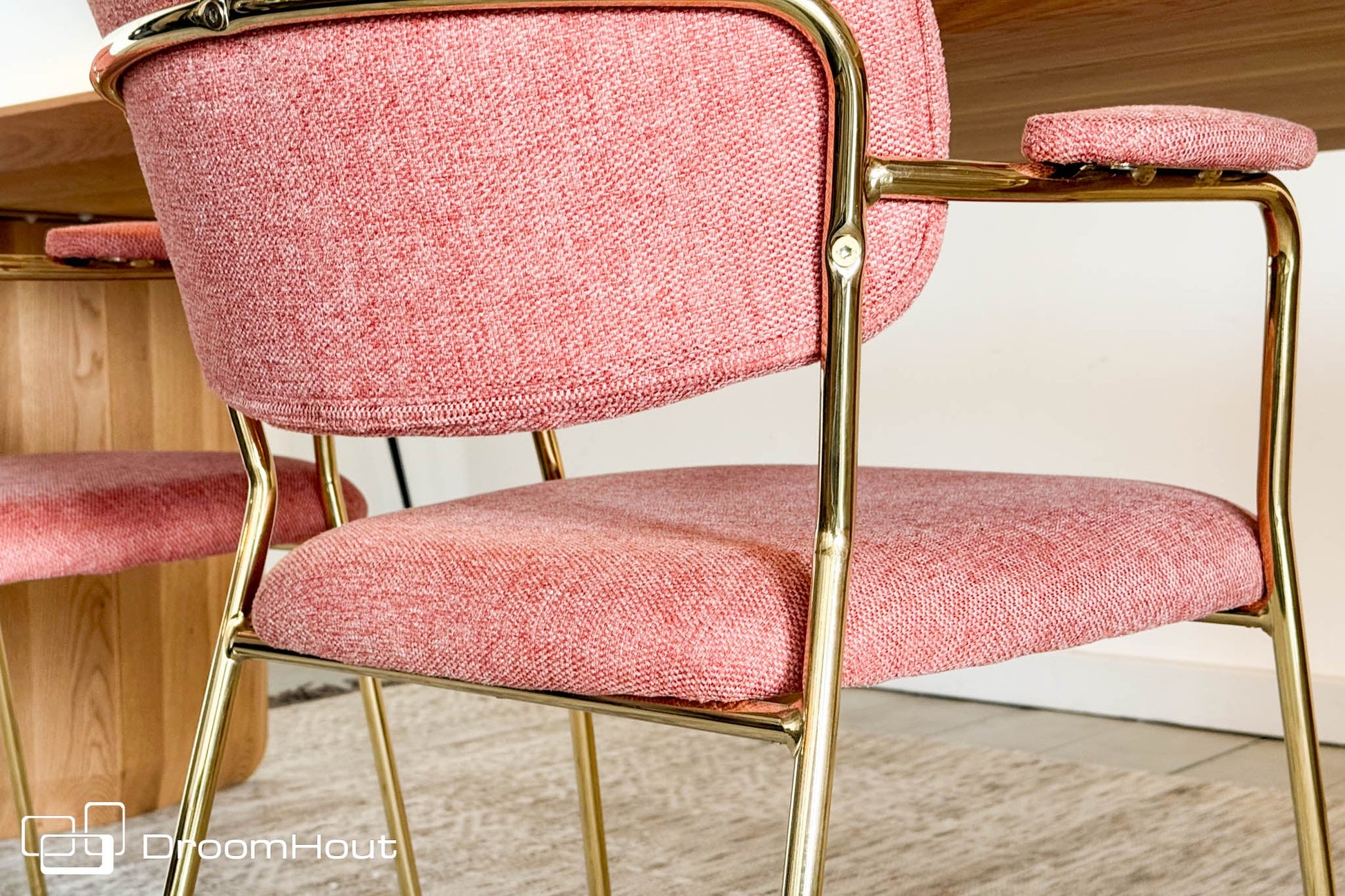 Doet stoel Jolien je ook niet meteen denken aan de klassieker Jolene van Dolly Parton? Wat een heerlijke retro eetkamerstoel is deze Jolien van DroomHout. Deze prachtige set van 2 scoor je nu voordelig, en helemaal ideaal want je kunt hem gelijk ophalen. Het gaat hierbij om de roze variant van de Jolien met een ene catcher van een frame. He goude frame maakt de stoel dan ook helemaal af. De zitting en rugleuning zijn van multiplex met PU schuim. Deze oogt en zit heerlijk. Mooi detail zijn de stiksels in de rug leuning. De stoel zelf heeft een afmeting van van 49 x 56 x 78 cm (BxDxH). De zithoogte is 48 cm en de zitdiepte 46,5 cm. De maximale belasting van de stoel is 150 kg.