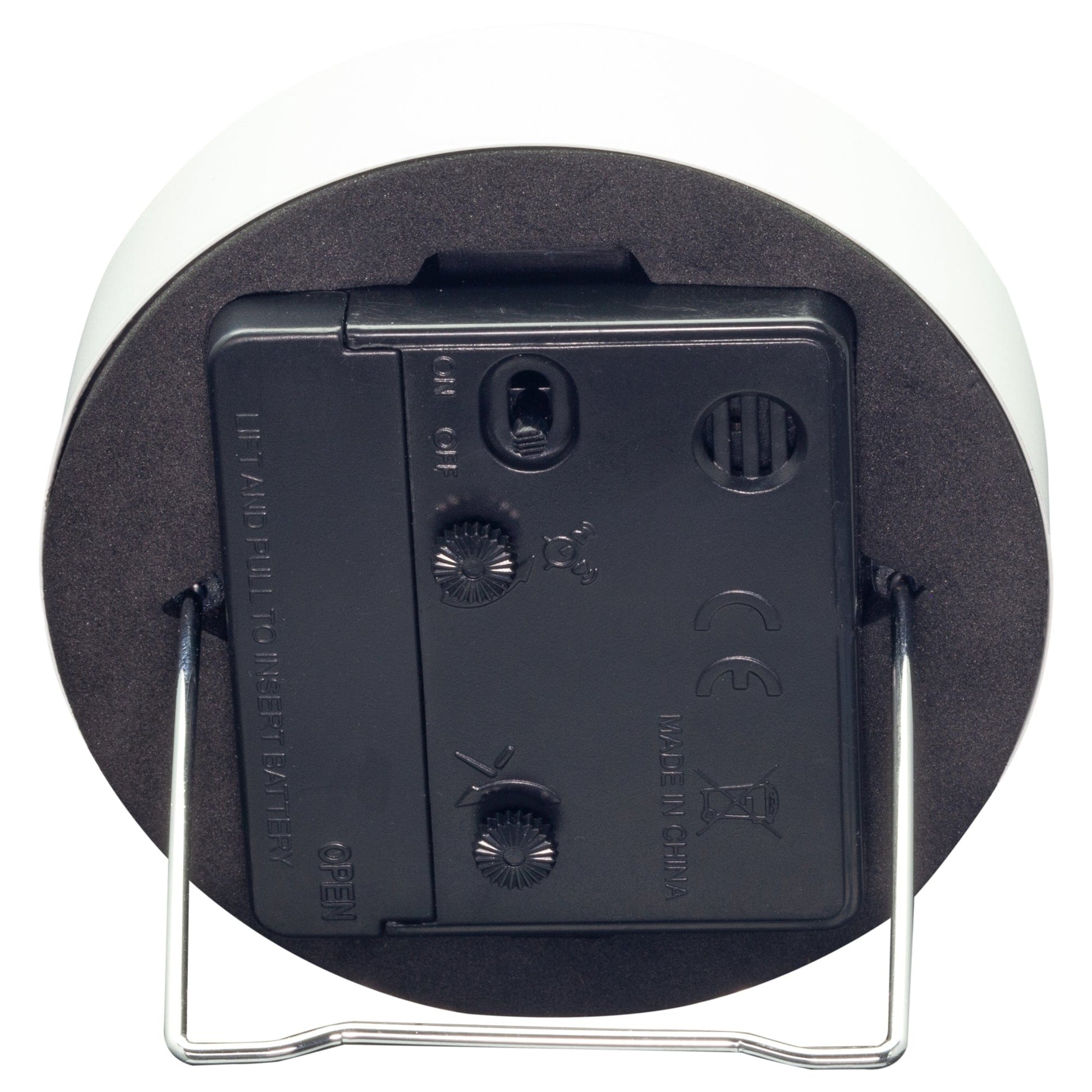 It's a sophisticated looking desk alarm clock featuring bold colours and design details in a simple edgy white metal case. Good as a table clock too!