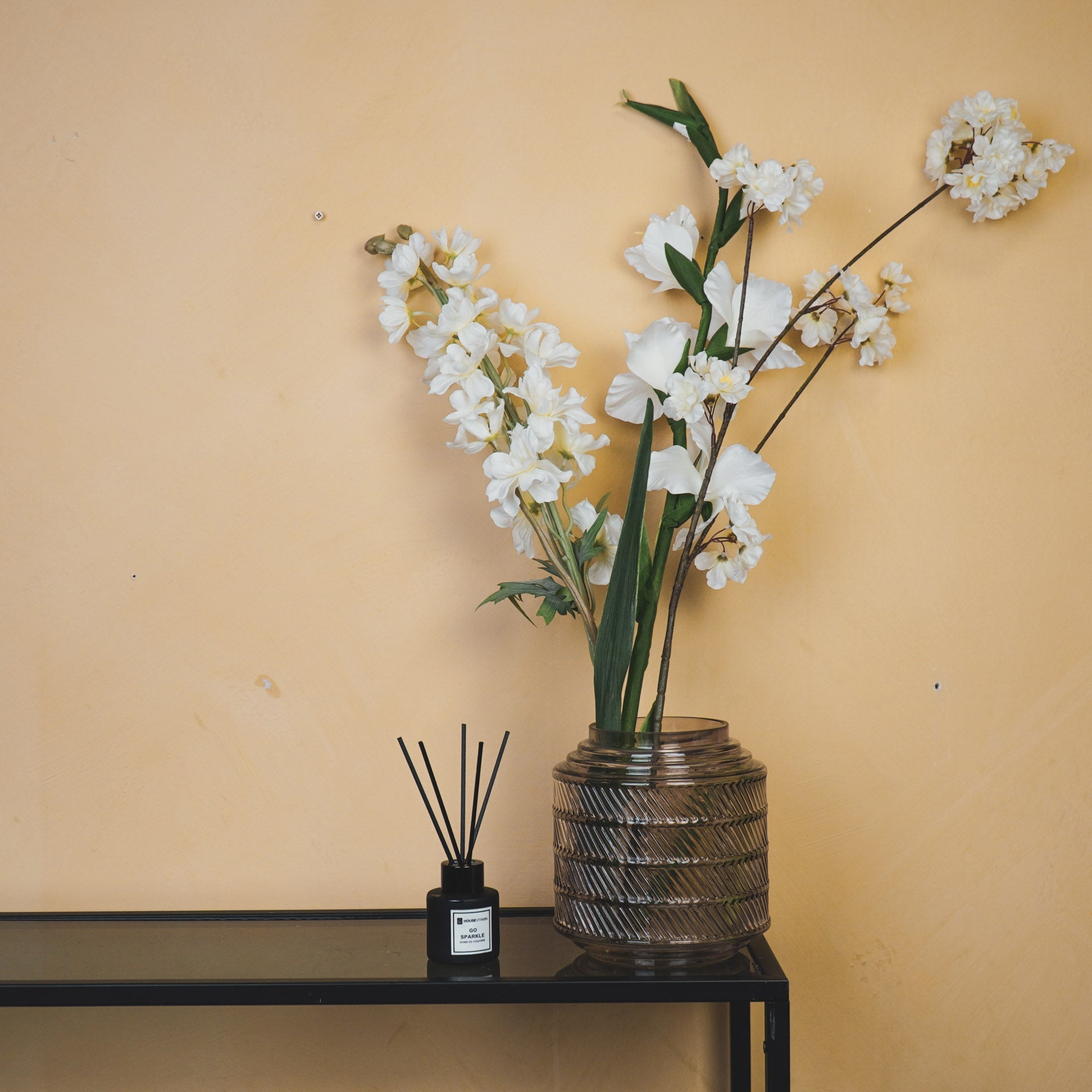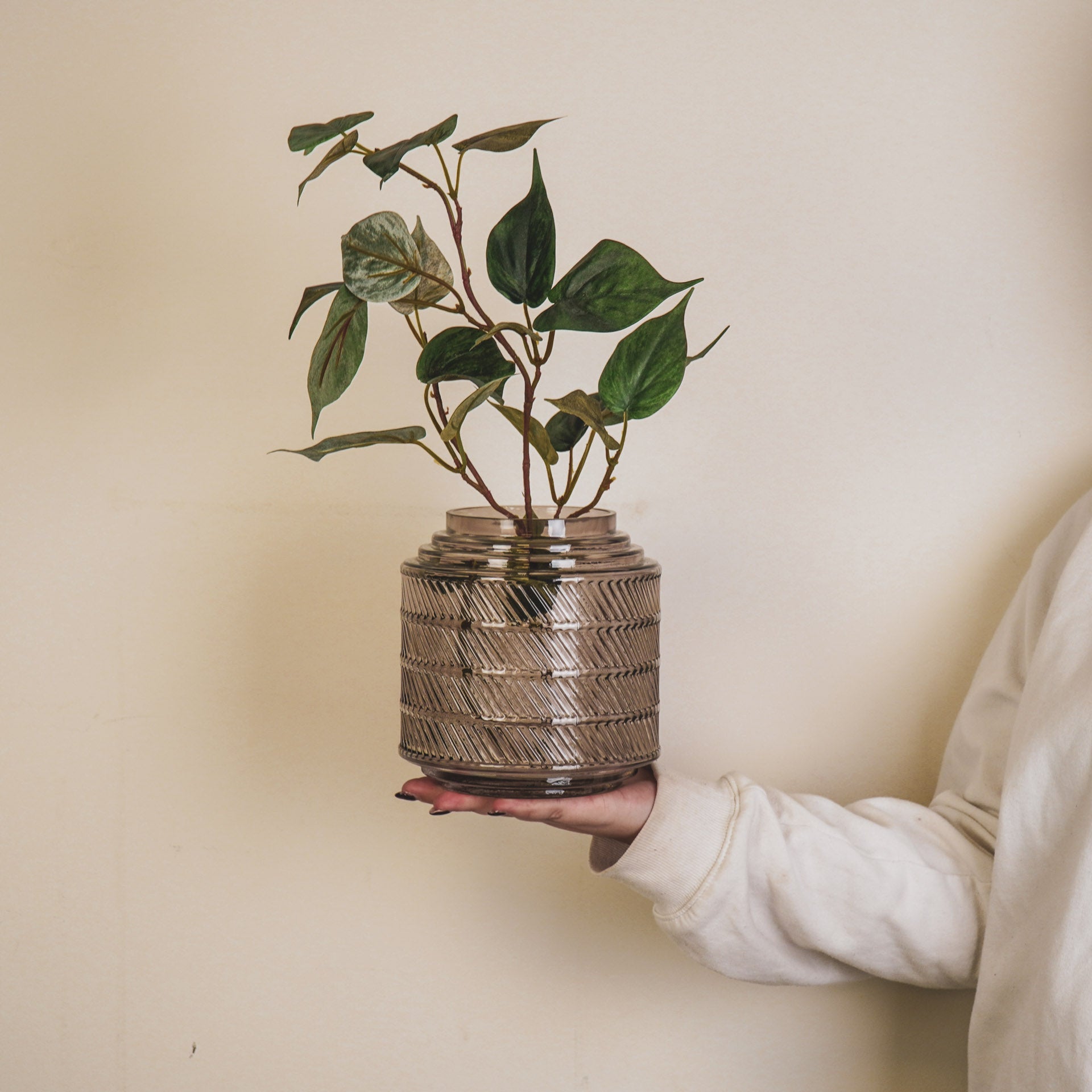 VAZEN HEB JE NOOIT GENOEG! Op zoek naar de perfecte bloemenvaas om je boeket tot leven te brengen? Deze prachtige smokey glazen vaas met reliëf van Housevitamin is precies wat je nodig hebt. Gemaakt van hoogwaardig glas en met een afmeting van 16x16 cm, is deze vaas een echte eyecatcher in jouw interieur.