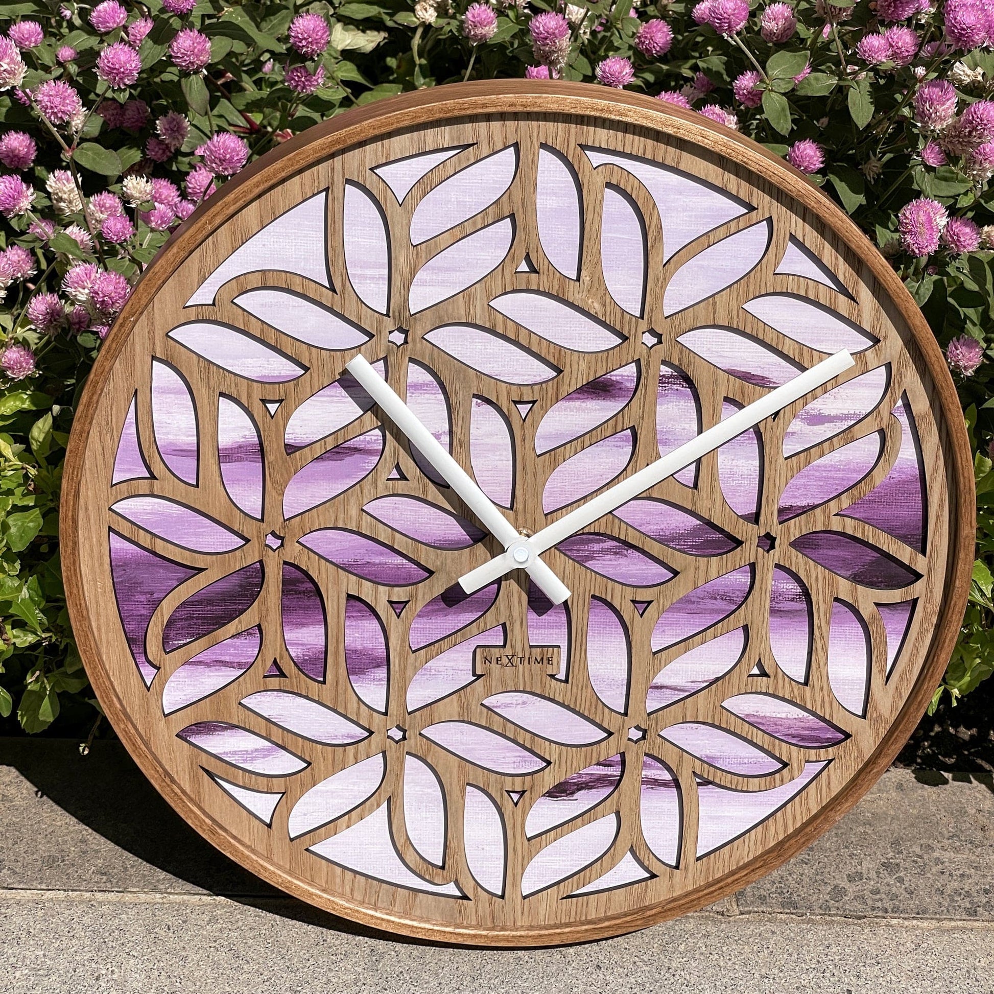The NeXtime Yogi silent wall clock (40cm) features natural wood cut in a harmonious floral pattern on top of an airy water colour background in a calming purple. Designed by Jett Scheib, it crates a connection to nature and will definitely bring elegance and peace to the room. This clock uses 1 x AA battery (not included).