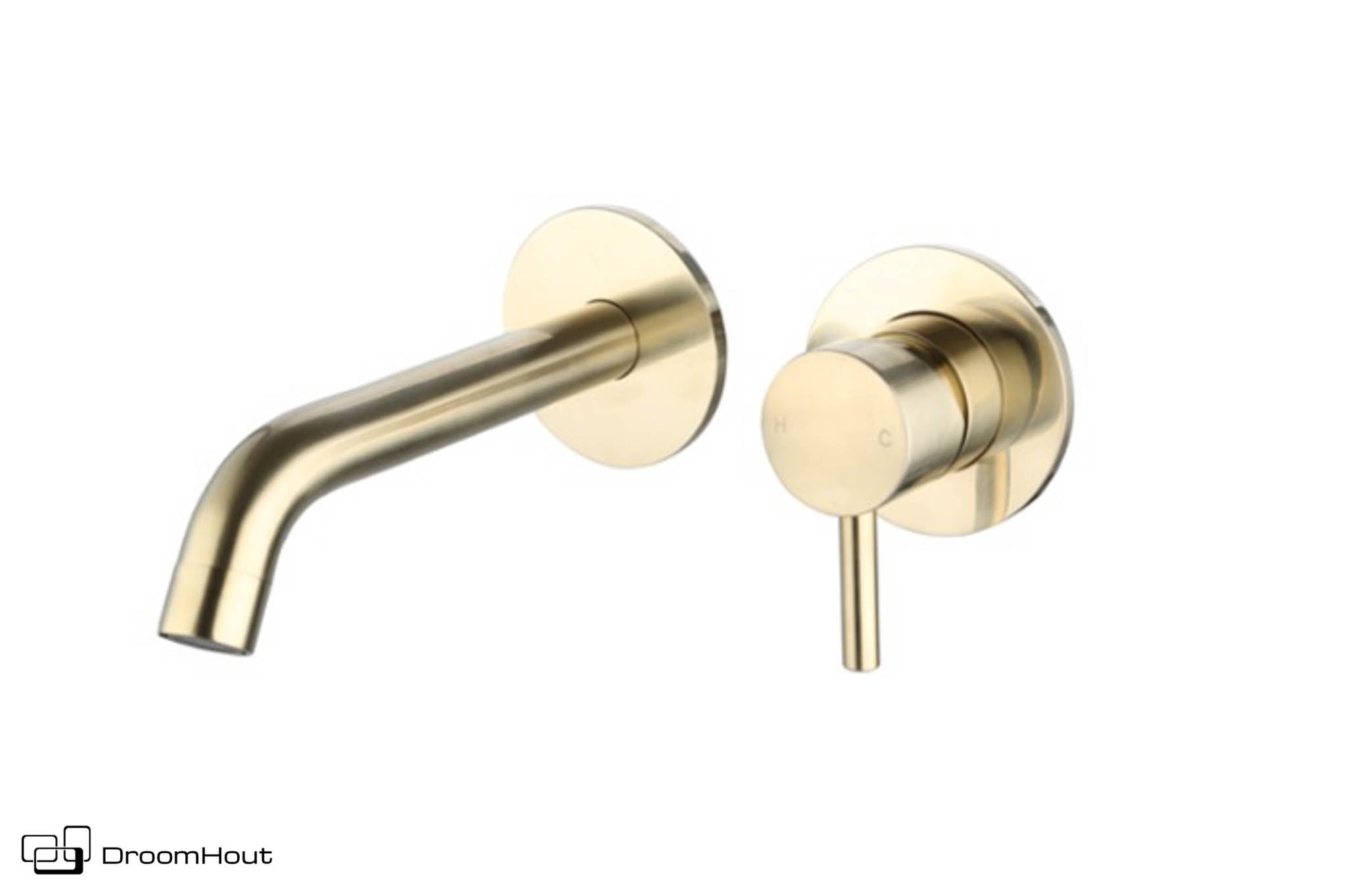 Ben je op zoek naar een stijlvolle en ruimtebesparende wastafelmengkraan? De inbouw wastafelkraan in geborsteld goud is de perfecte keuze voor een strak en modern badkamerontwerp met een vleugje luxe. Ideaal dus om te combineren met een badkamermeubel van DroomHout. In tegenstelling tot een opbouwkraan wordt deze kraan in de muur ingebouwd, wat zorgt voor een minimalistische en elegante uitstraling. Dankzij het tijdloze design past deze kraan perfect bij zowel moderne als klassieke badkamers en kan hij eenvoudig gecombineerd worden met waskommen of wastafels zonder kraangaten.